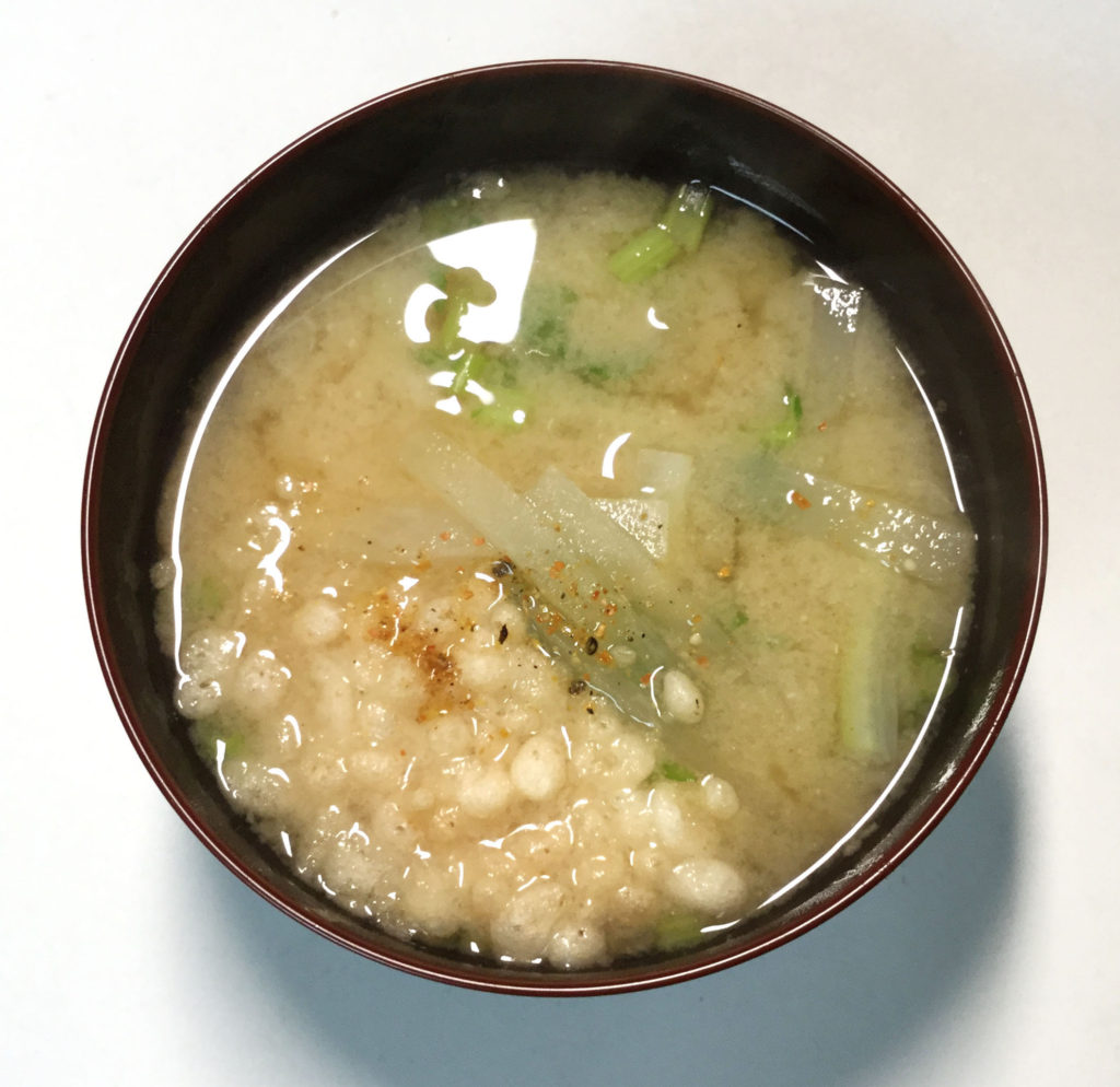 葉まで全部元気良さそうな大根だったので、皮ごとと葉っぱも一緒に刻んでお味噌汁に。一緒にするのはうす揚げか松山あげにしようと思ったけど、そろそろ使い切りたいなぁという揚げ玉があったのでそれを使いました。なにかしら油脂があると、よりおいしくなりますよね。